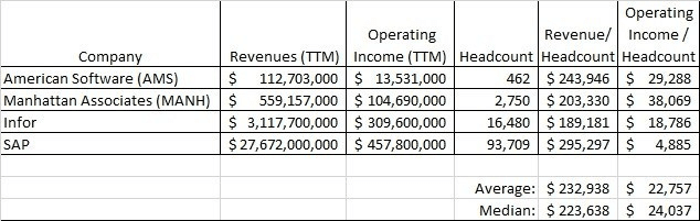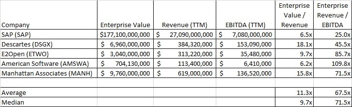 These are some metrics from public companies in the supply chain management space. When referencing public companies, your private company will usually be valued at a discount. Public companies have annual audits by independent accountants, have to comply with Sarbanes Oxley, and other regulations like the Foreign Corrupt Practices Act. Also, a public company’s equity is liquid — you can buy and sell it on stock exchanges. Private companies can’t do that. The size and revenues are also different. If your firm is $35 million in the size you cannot expect to command the same valuation as a Google or SAP. Typically the enterprise private firms are discounted by 30% to 40% in comparison to public companies.