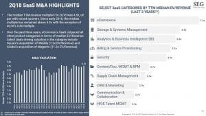 Surveys and reports can also demonstrate a firm’s subject matter expertise. In addition to product management, I have spent a lot of my career working on Mergers, Acquisitions & Divestitures. One of the best sources of information on tech M&A is published by the Software Equity Group. SEG “provides unparalleled M&A advisory services for emerging and established software companies.” They regularly publish free quantitative research about M&A transactions. One of the things I like about this research is that it provides a snapshot of what realistic valuations are for tech companies. Here’s an extract from their recent Q2 2018 report: