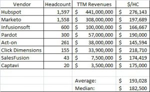 To estimate the revenue for the company you are interested in, find the total employee count (LinkedIn, Owler, or Crunchbase) and apply the ratio from your example of their peers. You can use the same ratios for private competitors reported by Owler or Crunchbase. Consider this table for marketing automation providers: