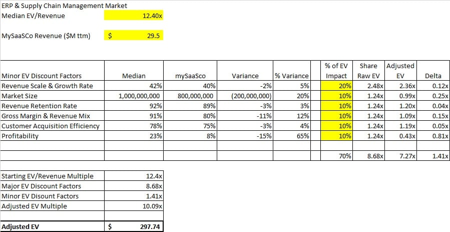 There are six common minor factors that are applied to private SaaS companies. Usually they are presented in context of the median performance in their market segment. Consider the following: