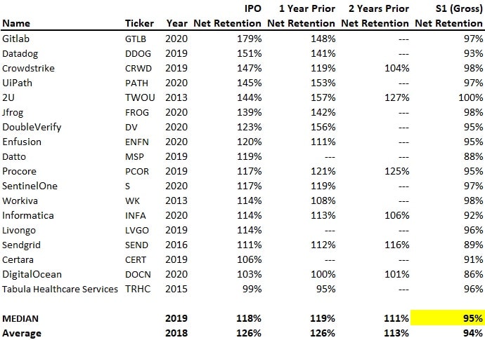 “While 91 SaaS companies disclose net dollar retention (which includes upgrades) at the time they went public, only 18 disclose gross dollar retention. That data is presented below and as you can see, median gross dollar retention is 95%. This figure is clearly subject to bias as so few companies report it, but it is nonetheless extraordinary. A few observations: