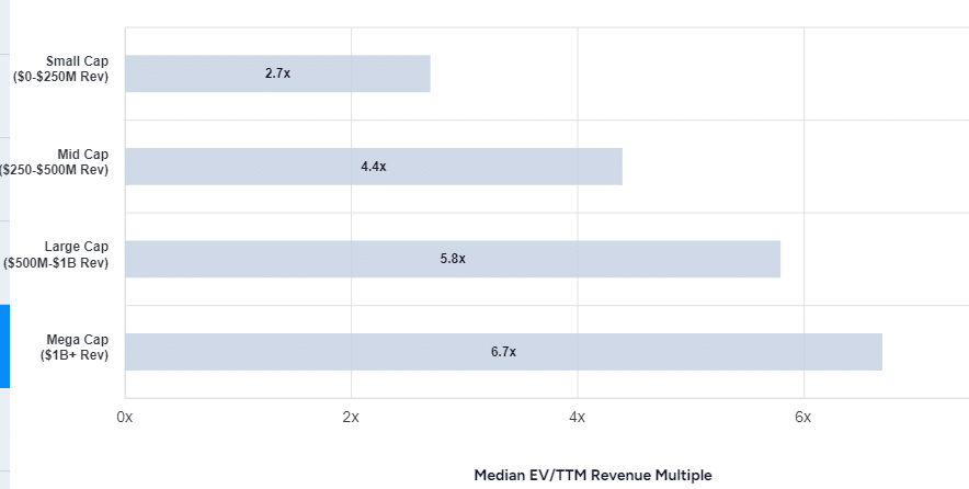 SaaS Valuations vary by company revenue size. Smaller revenue companies with lower relative revenues are valued less than bigger companies: