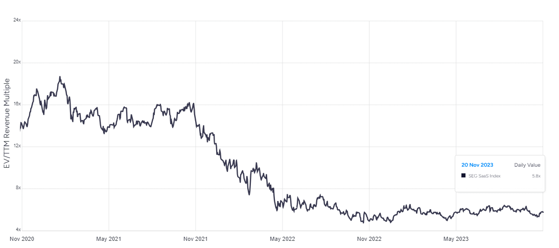 SaaS valuations fluctuate over time. This chart from the Software Equity Group’s SaaS Index shows how the median SaaS EV/Revenue has varied over the past three years from a high of 16.4x in February 2021 to 5.8x in November 2023: