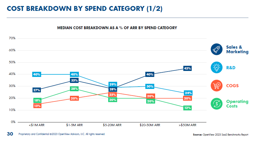 - Sales & Marketing: For <$1M ARR, median spend is 27% of ARR; for $1M-$5M ARR, it’s 35%.