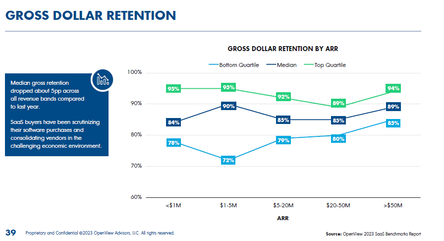 Gross dollar retention (GDR) measures the percentage of recurring revenue retained from existing customers, excluding upgrades. Median GDR for companies with ARR below $1M is 84%, while for those with $1M-$5M ARR, it’s 90%. This indicates a solid customer base that remains loyal even as the company scales.
