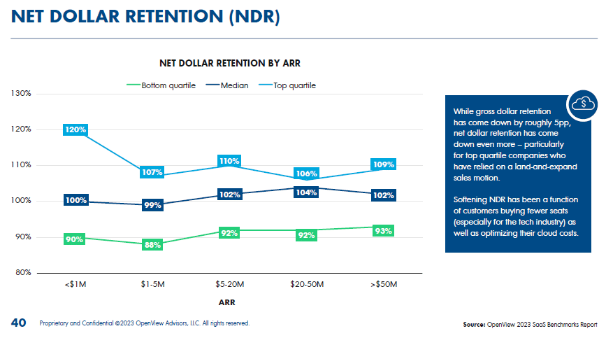 Net dollar retention (NDR) includes the impact of upsells, expansions, and churn. For companies with ARR below $1M, median NDR is 100%, indicating they retain and expand revenue within their existing customer base effectively. In the $1M-$5M ARR range, median NDR is 99%.