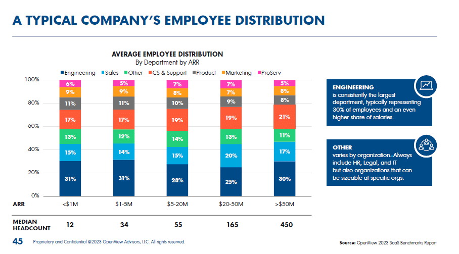 Employee distribution varies significantly across different ARR buckets. For companies with ARR below $1M, the median number of employees is 12, while those in the $1M-$5M range typically have 34 employees. Here’s a breakdown of how these employees are typically distributed across different departments: