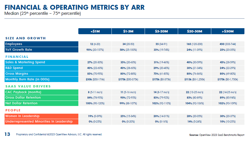 - COGS: For <$1M ARR, it’s 17% of ARR; for $1M-$5M ARR, it’s 20%.