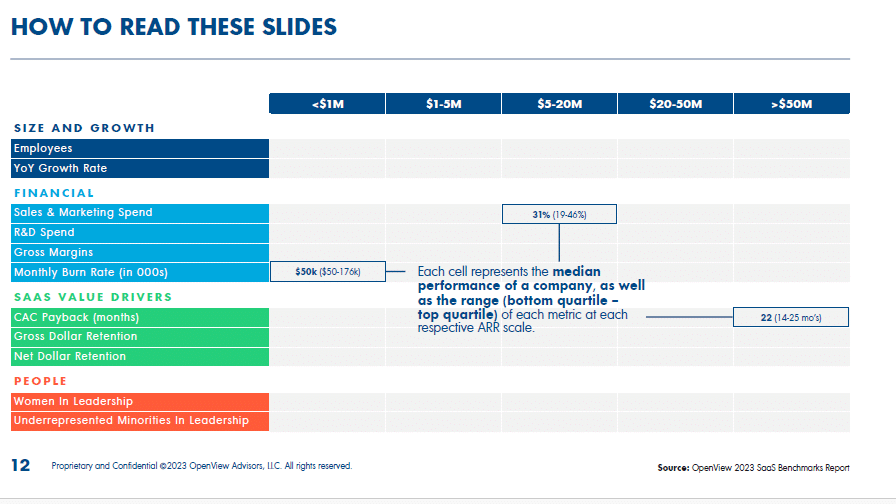 I work with many pre-seed and seed stage startups. Understanding key metrics is essential to navigating their growth journey. This summary of the 2023 OpenView SaaS Benchmarks Report focuses on seven crucial metrics categories for companies with ARR below $1M and between $1M and $5M. These insights are tailored to provide a clear and actionable overview helping you make informed decisions for your business. In this post, we will talk about:
