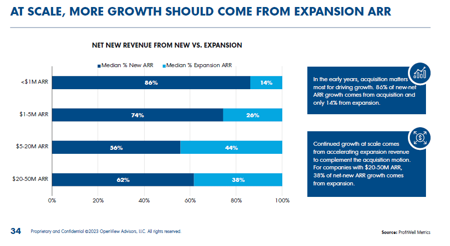 Expansion revenue becomes increasingly important as SaaS companies grow. In early stages (<$1M ARR), 86% of net new ARR comes from new customer acquisition, with only 14% from expansion. For companies in the $1M-$5M ARR range, 26% of net new ARR comes from expansion.