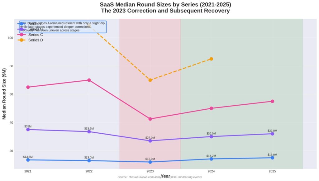 Series A rounds proved remarkably resilient, dipping only slightly to $12.0M in 2023 before quickly recovering to $14.2M in 2024 and reaching $15.0M in early 2025. This isn’t random. Series A represents the most familiar part of the venture path—the stage where product-market fit meets proven go-to-market execution. Investors returned here first because the risk profile feels manageable and the evaluation criteria are well-established.