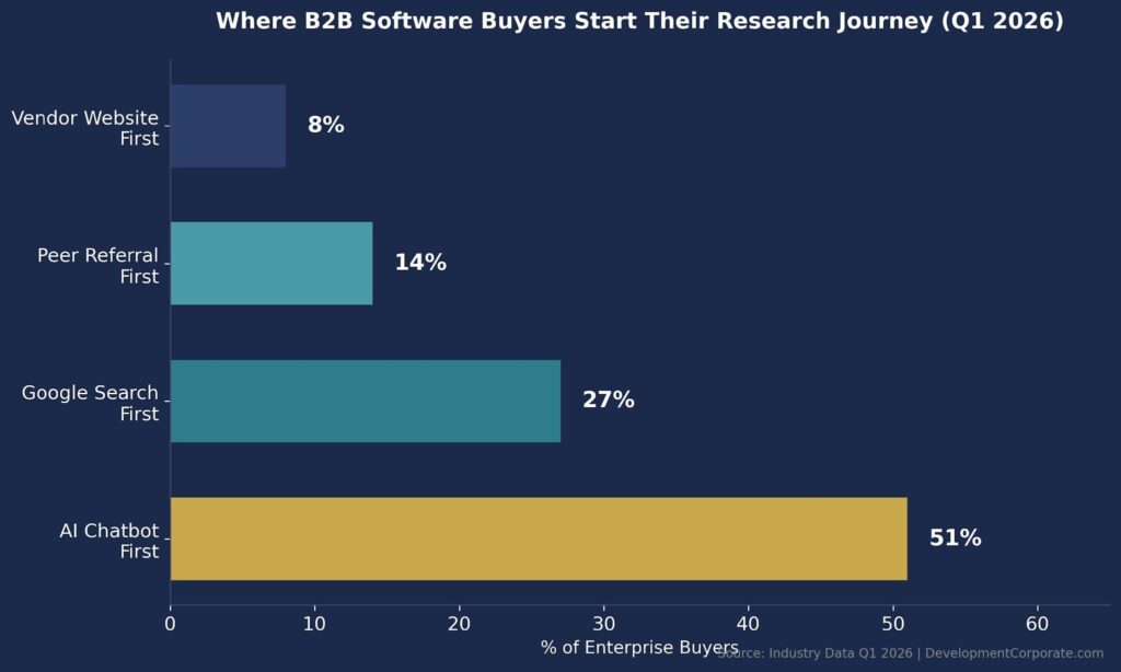 Figure 1: Where B2B software buyers start their research journey, Q1 2026. The AI chatbot channel has overtaken Google Search as the primary entry point.
