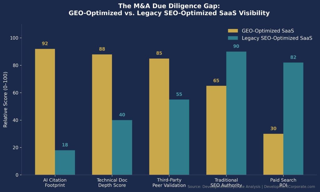 Figure 3: The M&A due diligence gap. GEO-optimized SaaS companies outperform on AI citation metrics while legacy SEO-optimized companies carry declining visibility in the channel that now initiates 51% of buyer journeys.