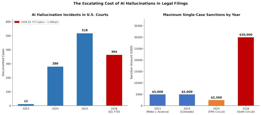 AI hallucinations in legal filings have crossed a threshold. Courts across the United States are no longer issuing polite warnings. They are sanctioning attorneys, striking briefs, revoking bar admissions, and — in the most egregious cases — issuing five-figure fines while threatening to forward cases to disciplinary boards. Researcher Damien Charlotin of HEC Paris has now catalogued over 1,174 documented incidents of AI-generated hallucinated content submitted in courts worldwide. Since the start of 2025 alone, 518 of those cases originated in U.S. courts — a number that is accelerating, not stabilizing.