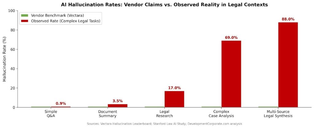 Figure 2: AI Hallucination Rates — Vendor Claims vs. Observed Reality by Task Complexity. The sub-1% benchmark measured under controlled conditions diverges dramatically from observed rates on complex legal tasks. Sources: Vectara Hallucination Leaderboard; Stanford Law AI Study; DevelopmentCorporate.com analysis.