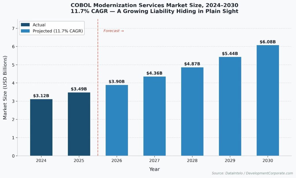 Figure: COBOL Modernization Services Market Size 2024–2030. Alt: Bar chart showing COBOL modernization market growing from $3.12B in 2024 to $6.08B by 2030 at 11.7% CAGR