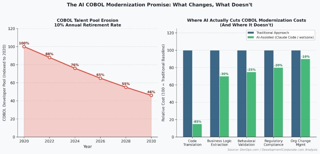 Figure: AI Impact on COBOL Modernization Cost Components. Alt: Two-panel chart: left shows COBOL developer talent pool declining 10% annually; right shows AI reduces code translation cost by 85% but has minimal impact on business logic extraction and regulatory compliance