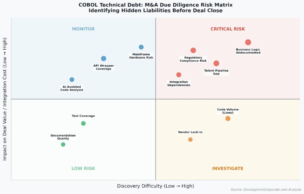 Figure: COBOL Technical Debt M&A Due Diligence Risk Matrix. Alt: Scatter plot risk matrix showing COBOL due diligence factors by discovery difficulty and impact on deal value, with undocumented business logic and talent pipeline gaps in the critical risk quadrant