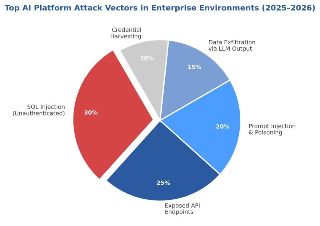 Figure 3: Primary attack vectors targeting enterprise AI platforms in 2025–2026. SQL injection via unauthenticated endpoints was the entry point in the McKinsey breach.