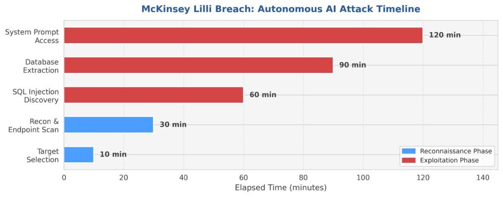 Figure 1: McKinsey Lilli AI platform breach timeline — full read/write access achieved in 120 minutes by an autonomous AI agent. Source: CodeWall, March 2026.