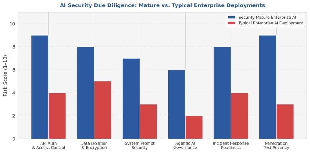 Figure 4: AI security due diligence scoring — security-mature enterprise deployments vs. typical implementations. The McKinsey breach reflects the “typical” profile across most dimensions.