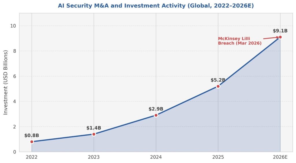 Figure 5: AI security investment has grown 11x since 2022, reflecting institutional recognition that enterprise AI platforms require a new security architecture. The McKinsey Lilli breach will accelerate this trend.