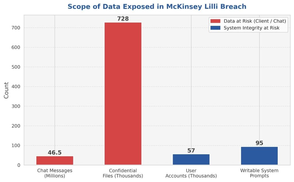Figure 2: Scope of data exposed in the McKinsey Lilli breach. System prompts were writable — enabling silent AI output manipulation at scale.