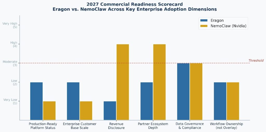 Figure 3: 2027 Commercial Readiness Scorecard — Eragon vs. NemoClaw across six enterprise adoption dimensions. Scores above the dashed threshold line (3.0) indicate readiness. Both platforms currently score below threshold on platform maturity and customer base scale.