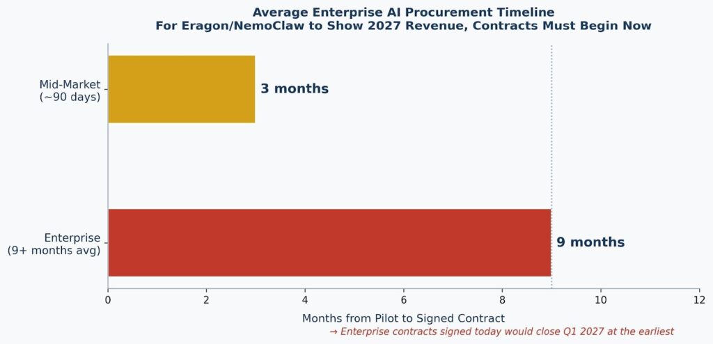 For Eragon and NemoClaw, the MIT data creates a specific commercial math problem. “Commercial success in 2027” is not a technology milestone. It is a revenue milestone. And revenue at enterprise scale requires contracts — which require procurement cycles.