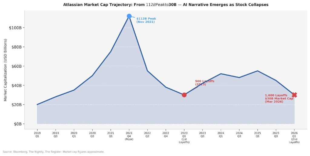 Figure 1: Atlassian’s market cap trajectory. The “AI-first” narrative emerges precisely when the stock collapses to its 2019 levels. Source: Bloomberg, The Register (approximate figures).