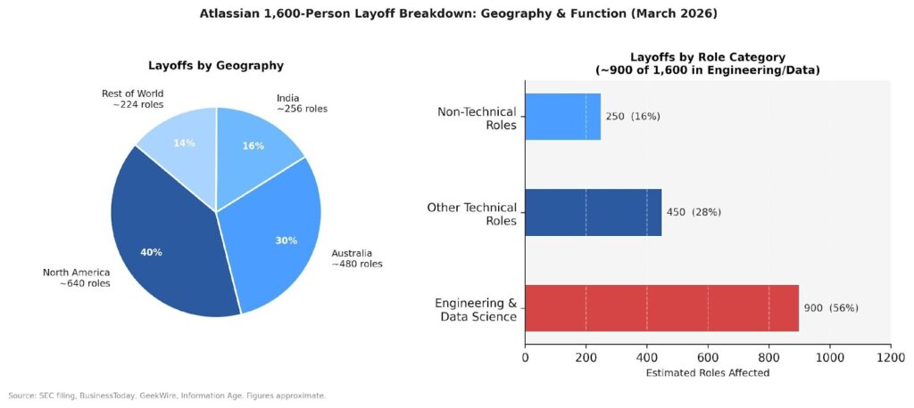 Figure 2: Atlassian’s 1,600-person layoff breakdown by geography and function. Engineering and data science account for roughly 900 of the 1,600 eliminated roles. Source: SEC filing, BusinessToday, GeekWire.
