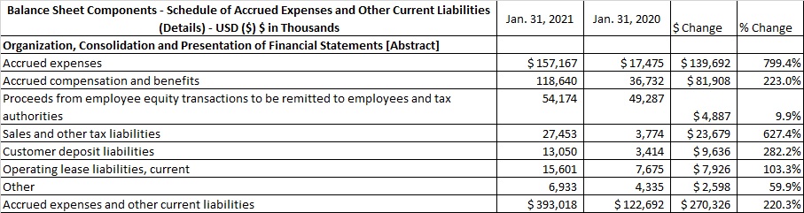 Most items are self-explanatory. Zoom grew its revenues by over $2 billion in 2021 (325%). Logically, items like accounts payable would grow significantly. Zoom provided more detail about the growth of accrued expenses and other current liabilities: