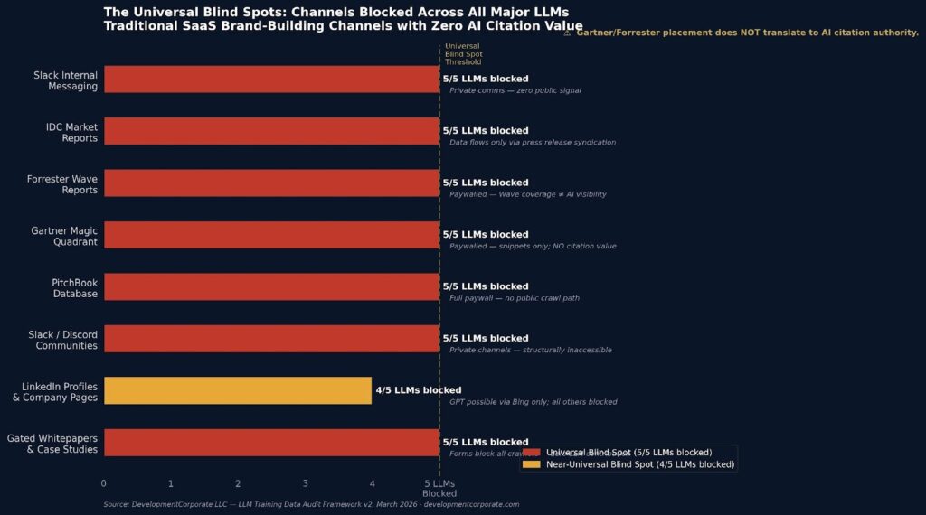 Figure 2: The Universal Blind Spots — channels blocked across all major LLMs. Traditional SaaS GTM investment in these channels generates zero AI citation return. Source: DevelopmentCorporate LLC, March 2026.