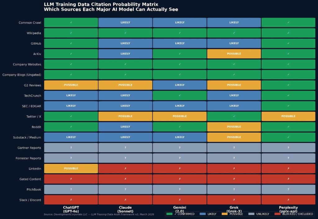 Figure 1: LLM Training Data Citation Probability Matrix. Confidence levels assessed against published model cards, technical papers, and verified licensing deals. Non-disclosed items assessed by inference. Source: DevelopmentCorporate LLC, March 2026.