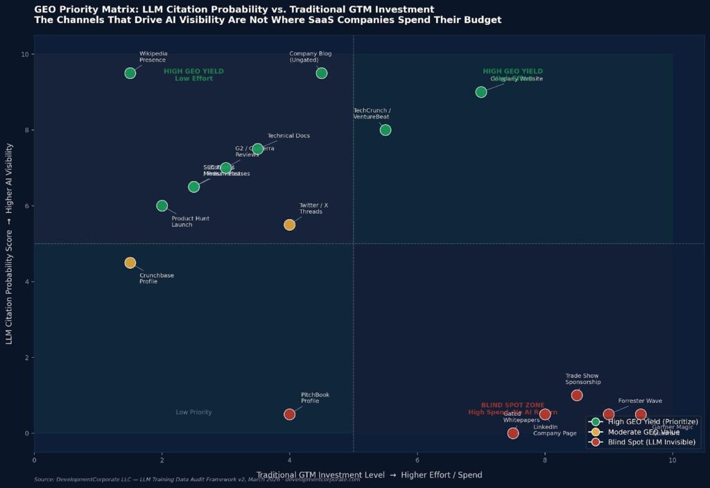 Figure 3: GEO Priority Matrix — LLM citation probability score vs. traditional GTM investment level. Channels in the upper-left quadrant deliver the highest AI visibility ROI. Source: DevelopmentCorporate LLC, March 2026.