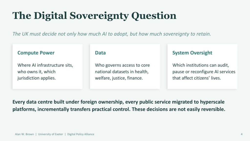 Brown identifies three dimensions of sovereignty at risk: compute power (where the infrastructure sits and who owns it), data (who governs access to core national datasets in health, welfare, finance, and justice), and system oversight (which institutions can audit, pause, or reconfigure AI services that affect citizens’ lives).