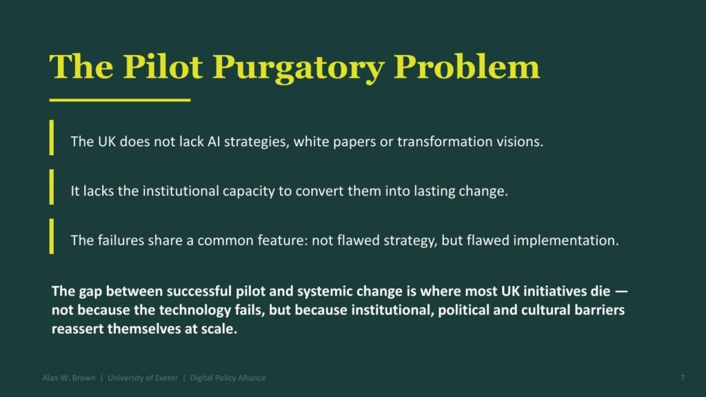 “The gap between successful pilot and systemic change is where most UK initiatives die — not because the technology fails, but because institutional, political and cultural barriers reassert themselves at scale.” — Alan W. Brown