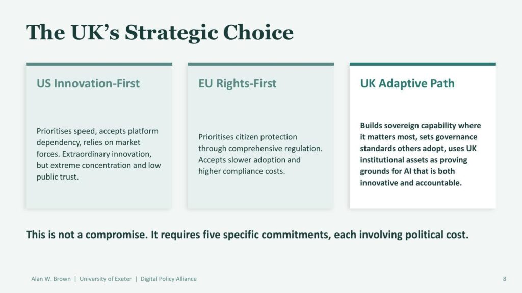 One of the book’s most analytically useful contributions is its comparative framework for national AI governance approaches. Brown identifies three models: the US innovation-first approach (prioritizes speed, accepts platform dependency, relies on market forces), the EU rights-first approach (prioritizes citizen protection through comprehensive regulation, accepts slower adoption), and the UK adaptive path (attempts to build sovereign capability where it matters most while setting governance standards others adopt).