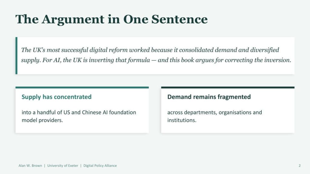 Professor Alan W. Brown of the University of Exeter Business School and Research Director of the Digital Policy Alliance has written a book ostensibly about the United Kingdom’s national AI strategy. Published in 2026 by London Publishing Partnership, it is structured as a policy argument with a clear thesis: the UK is repeating the same structural mistakes in AI that it made in earlier waves of digital transformation — and time is running out to correct them.