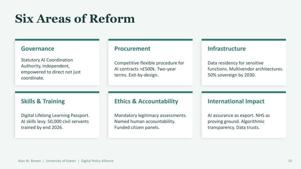 Brown concludes with a six-part reform agenda covering governance, procurement, infrastructure, skills and training, ethics and accountability, and international positioning. For UK policymakers, these are specific recommendations with named institutional mechanisms and measurable targets. For enterprise technology leaders, they function as a governance checklist.
