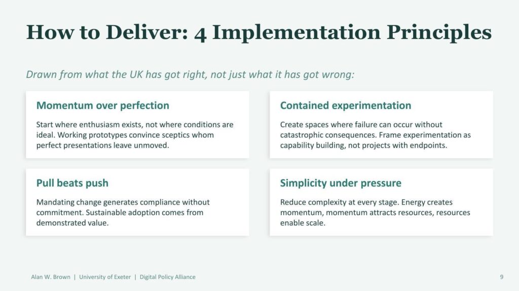 The most immediately practical section of the book is Brown’s articulation of four implementation principles drawn from successful UK digital transformation programs. These are presented as lessons from what actually worked — not just from failures.