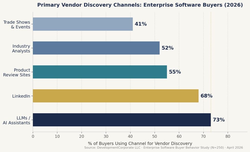 Figure 1: Primary vendor discovery channels ranked by usage among enterprise software buyers (N=250, April 2026). LLMs have overtaken LinkedIn, analyst reports, and peer review platforms.