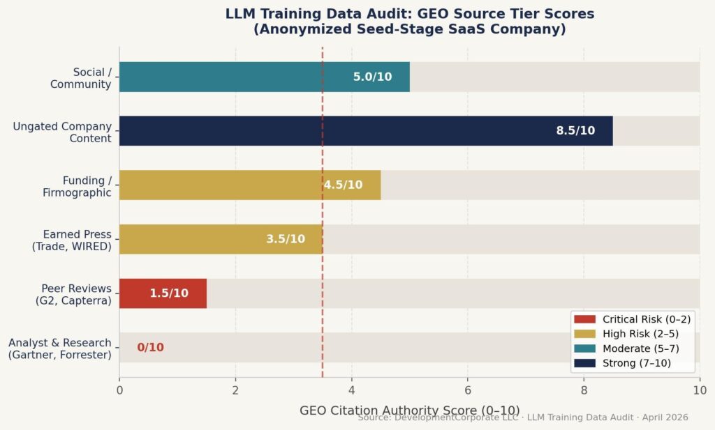 Figure 3: LLM Training Data Audit — GEO source tier scores for an anonymized seed-stage agentic software platform. Strong ungated content is offset by thin peer review presence and absent analyst coverage.