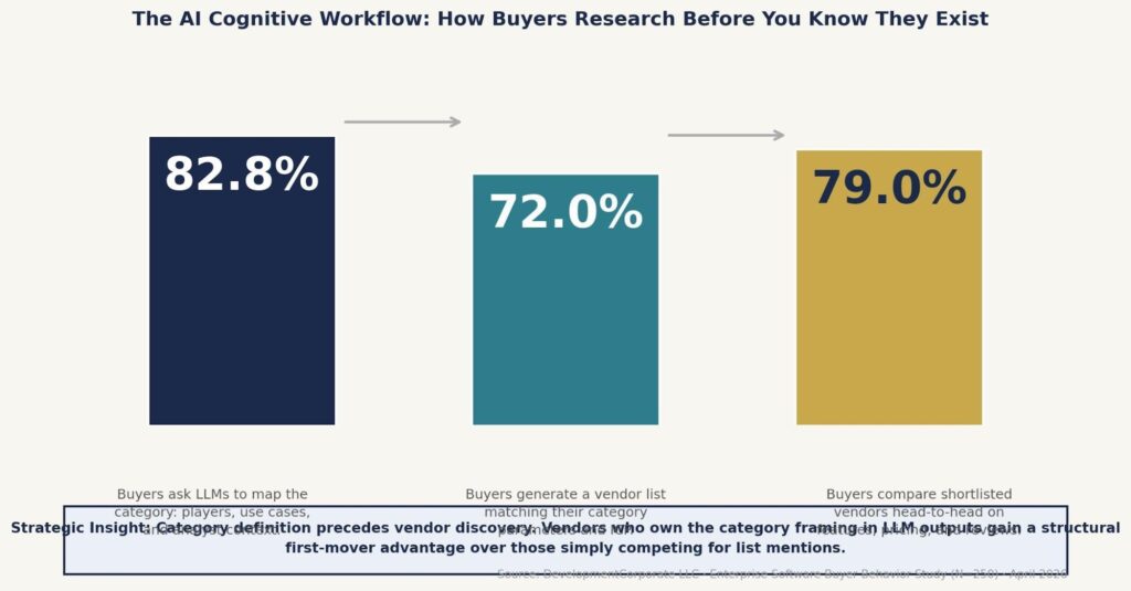 Figure 2: The AI Cognitive Workflow — how enterprise software buyers use LLMs across three sequential research stages. Category framing precedes vendor discovery.